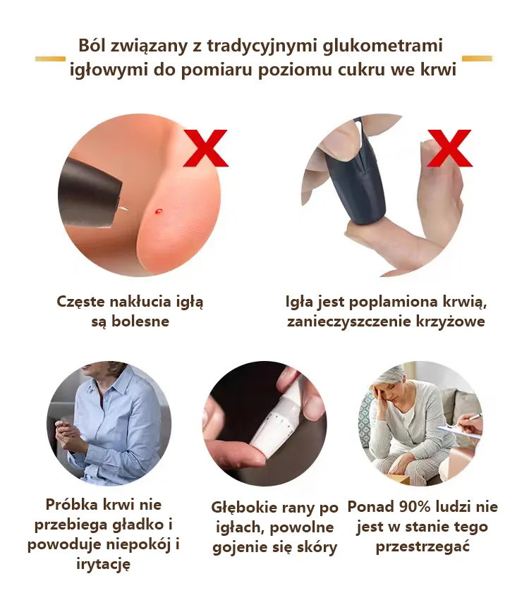 Koniec z inwazyjnymi i ryzykownymi badaniami poziomu cukru we krwi! Zbadaj poziom cukru we krwi bezpiecznie, bez ryzyka zakażenia krzyżowego lub ukłucia igłą palców.