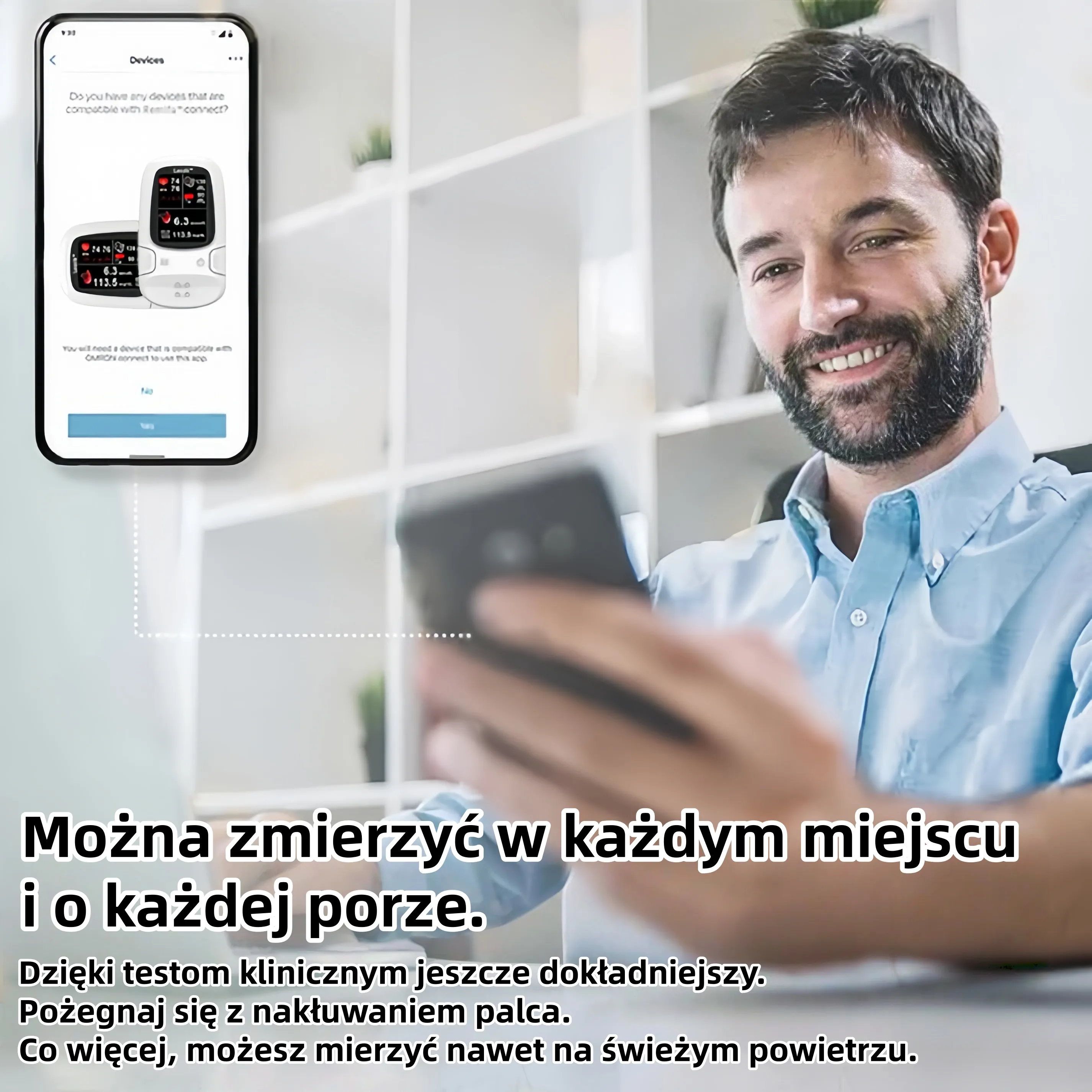 Nieinwazyjna technologia bez nakłuwania – mierz w dowolnym miejscu, o każdej porze i bezboleśnie.